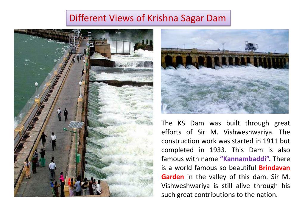 Different Views of Krishna Sagar Dam The KS Dam was built through great efforts of Sir M. Vishweshwariya. The construction work was started in 1911 but completed in 1933. This Dam is also famous with name “Kannambaddi”. There is a world famous so beautiful Brindavan Garden in the valley of this dam. Sir M. Vishweshwariya is still alive through his such great contributions to the nation.