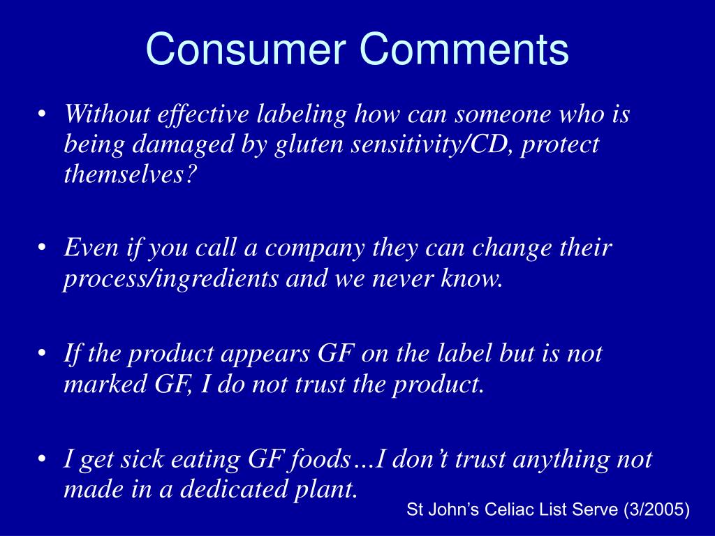 Consumer Comments • Without effective labeling how can someone who is being damaged by gluten sensitivity/CD, protect themselves? • Even if you call a company they can change their process/ingredients and we never know. • If the product appears GF on the label but is not marked GF, I do not trust the product. • I get sick eating GF foods…I don’t trust anything not made in a dedicated plant. St John’s Celiac List Serve (3/2005)