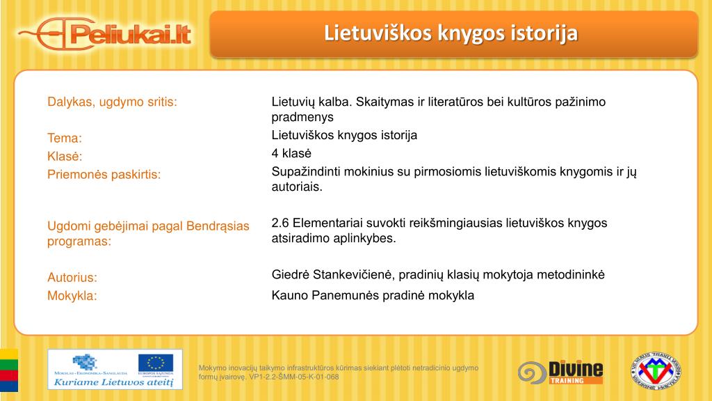Lietuviškos knygos istorija Dalykas, ugdymo sritis: Tema: Klasė: Priemonės paskirtis: Ugdomi gebėjimai pagal Bendrąsias programas: Autorius: Mokykla: Lietuvių kalba. Skaitymas ir literatūros bei kultūros pažinimo pradmenys Lietuviškos knygos istorija 4 klasė Supažindinti mokinius su pirmosiomis lietuviškomis knygomis ir jų autoriais. 2.6 Elementariai suvokti reikšmingiausias lietuviškos knygos atsiradimo aplinkybes. Giedrė Stankevičienė, pradinių klasių mokytoja metodininkė Kauno Panemunės pradinė mokykla