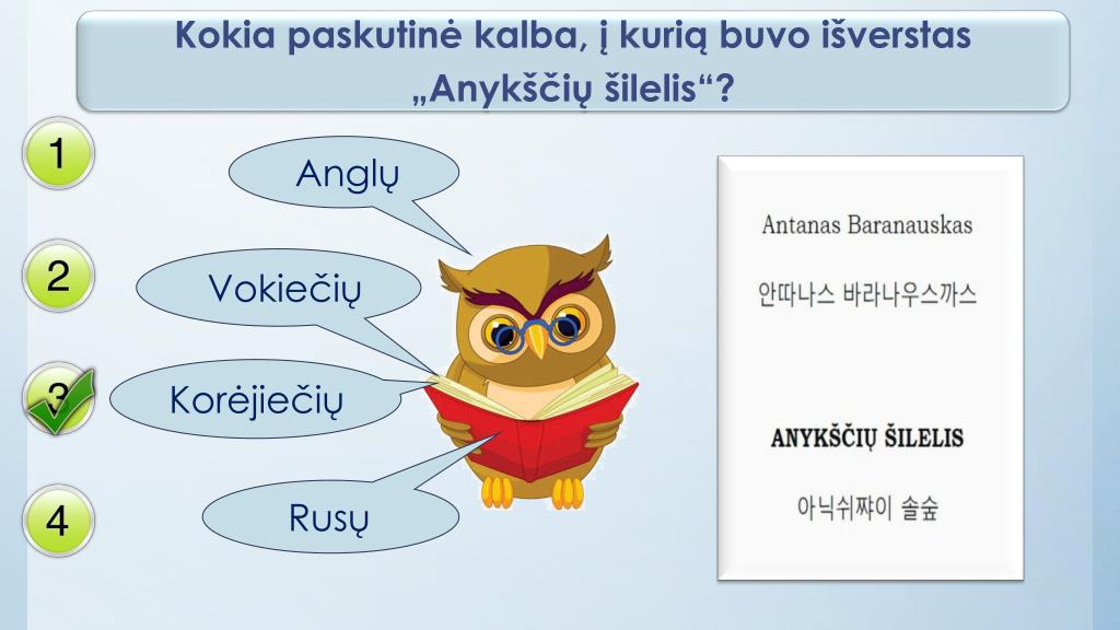 Kokia paskutinė kalba, į kurią buvo išverstas „Anykščių šilelis“? Korėjiečių Anglų Vokiečių Korėjiečių Rusų