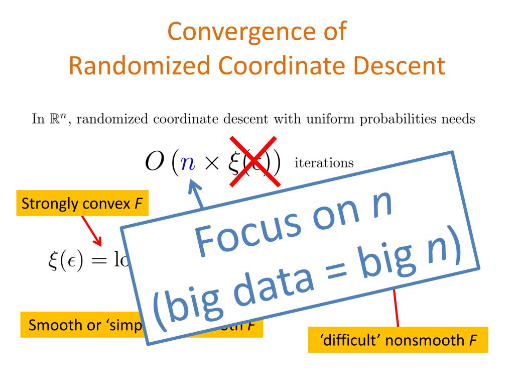 Convergence of Randomized Coordinate Descent Focus on n (big data = big n) Strongly convex F Smooth or ‘simple’ nonsmoothF ‘difficult’ nonsmoothF