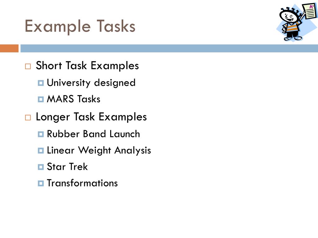 Example Tasks • Short Task Examples • University designed • MARS Tasks • Longer Task Examples • Rubber Band Launch • Linear Weight Analysis • Star Trek • Transformations