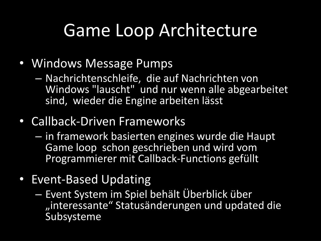 Game Loop Architecture • Windows Message Pumps • Nachrichtenschleife, die auf Nachrichten von Windows "lauscht" und nur wenn alle abgearbeitet sind, wieder die Engine arbeiten lässt • Callback-Driven Frameworks • in framework basierten engines wurde die Haupt Game loop schon geschrieben und wird vom Programmierer mit Callback-Functionsgefüllt • Event-BasedUpdating • Event System im Spiel behält Überblick über „interessante“ Statusänderungen und updated die Subsysteme
