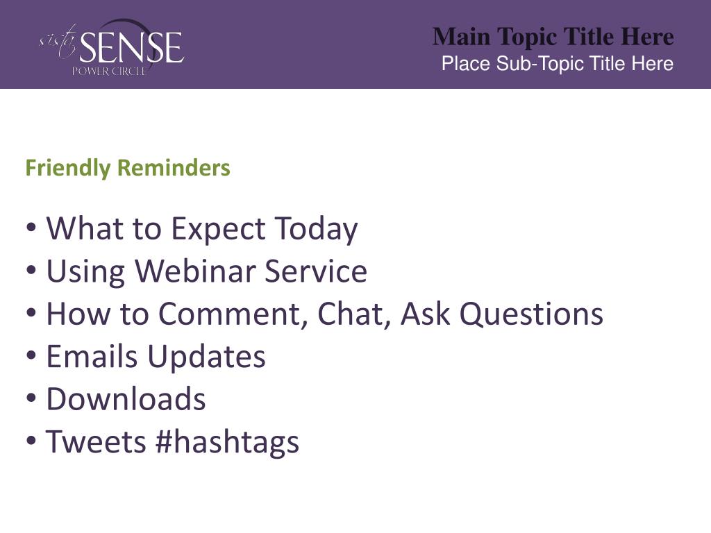 Main Topic Title HerePlace Sub-Topic Title Here • Friendly Reminders • What to Expect Today • Using Webinar Service • How to Comment, Chat, Ask Questions • Emails Updates • Downloads • Tweets #hashtags
