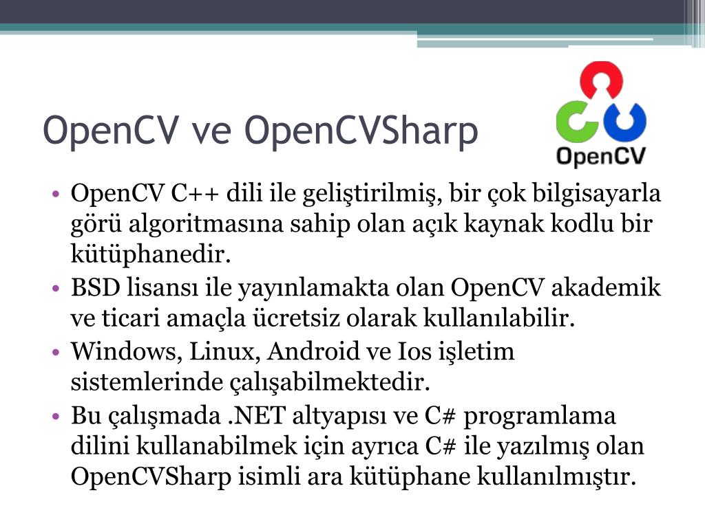 OpenCV ve OpenCVSharp • OpenCV C++ dili ile geliştirilmiş, bir çok bilgisayarla görü algoritmasına sahip olan açık kaynak kodlu bir kütüphanedir. • BSD lisansı ile yayınlamakta olan OpenCV akademik ve ticari amaçla ücretsiz olarak kullanılabilir. • Windows, Linux, Android ve Ios işletim sistemlerinde çalışabilmektedir. • Bu çalışmada .NET altyapısı ve C# programlama dilini kullanabilmek için ayrıca C# ile yazılmış olan OpenCVSharp isimli ara kütüphane kullanılmıştır.