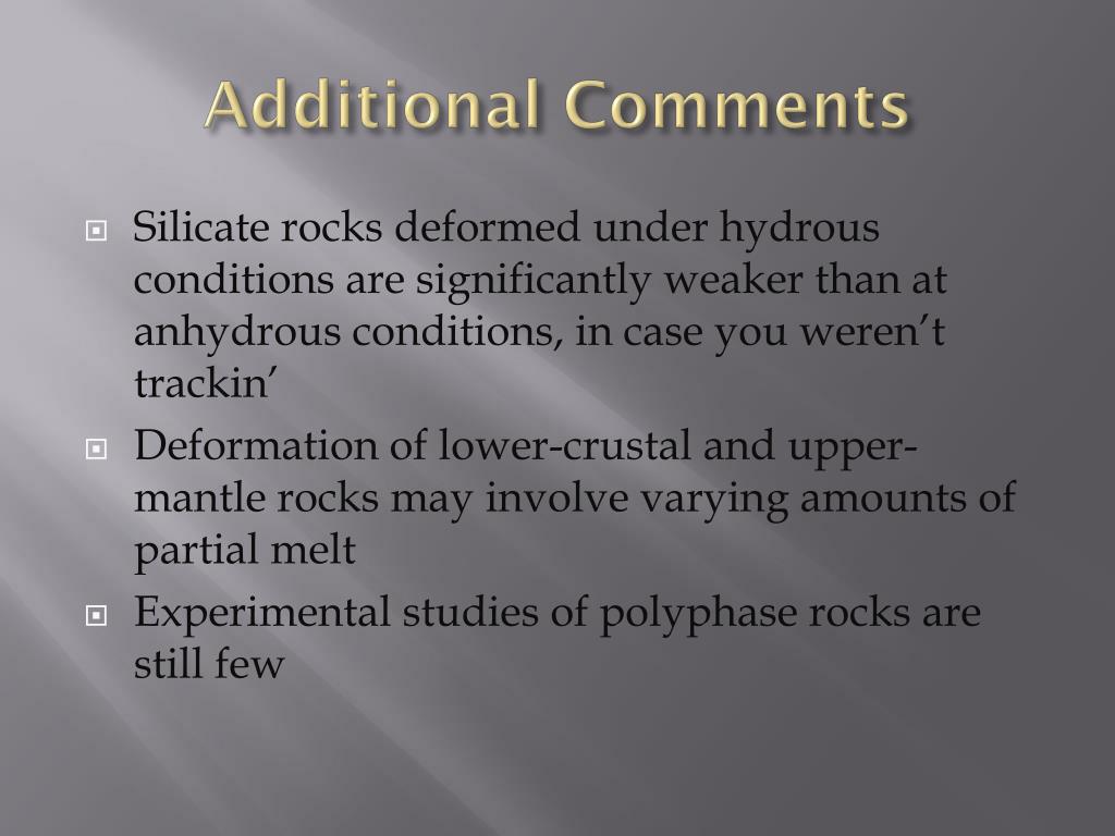 Additional Comments • Silicate rocks deformed under hydrous conditions are significantly weaker than at anhydrous conditions, in case you weren’t trackin’ • Deformation of lower-crustal and upper-mantle rocks may involve varying amounts of partial melt • Experimental studies of polyphase rocks are still few