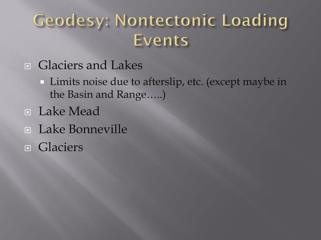 Geodesy: Nontectonic Loading Events • Glaciers and Lakes • Limits noise due to afterslip, etc. (except maybe in the Basin and Range…..) • Lake Mead • Lake Bonneville • Glaciers