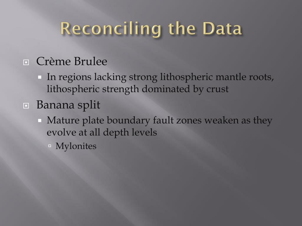 Reconciling the Data • Crème Brulee • In regions lacking strong lithospheric mantle roots, lithospheric strength dominated by crust • Banana split • Mature plate boundary fault zones weaken as they evolve at all depth levels • Mylonites