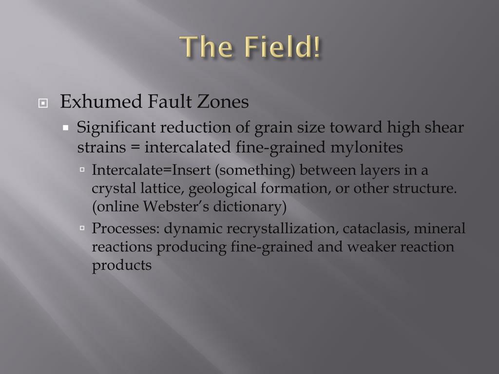 The Field! • Exhumed Fault Zones • Significant reduction of grain size toward high shear strains = intercalated fine-grained mylonites • Intercalate=Insert (something) between layers in a crystal lattice, geological formation, or other structure. (online Webster’s dictionary) • Processes: dynamic recrystallization, cataclasis, mineral reactions producing fine-grained and weaker reaction products
