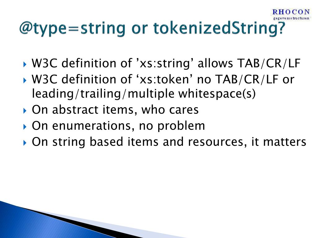 @type=stringortokenizedString? • W3C definition of ’xs:string’ allows TAB/CR/LF • W3C definition of ‘xs:token’ no TAB/CR/LF orleading/trailing/multiple whitespace(s) • On abstract items, whocares • Onenumerations, noproblem • Onstringbased items and resources, itmatters