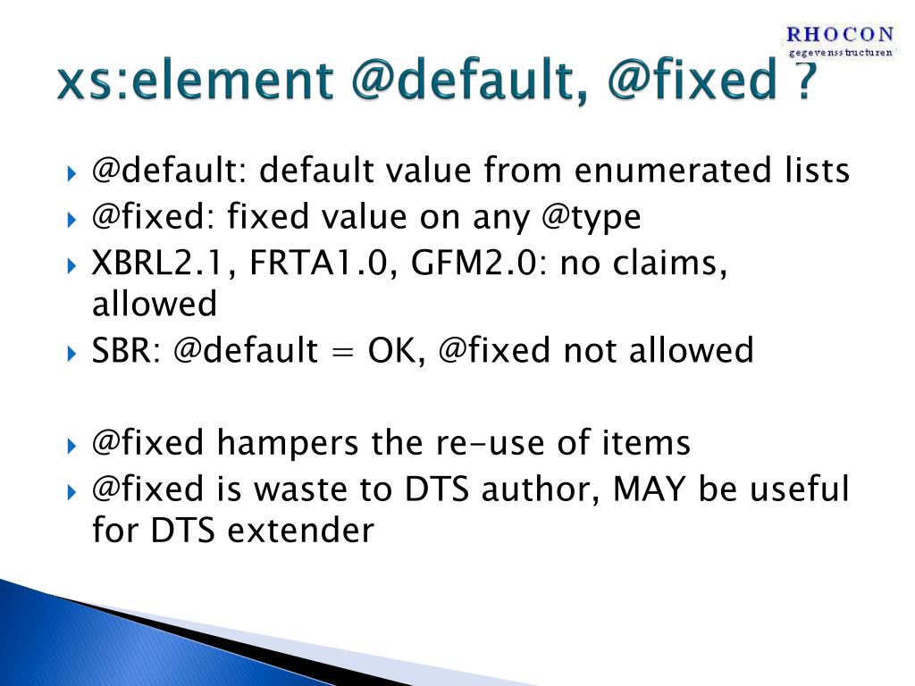 xs:element @default, @fixed ? • @default: defaultvaluefromenumeratedlists • @fixed: fixedvalueonany @type • XBRL2.1, FRTA1.0, GFM2.0: no claims, allowed • SBR: @default = OK, @fixednotallowed • @fixed hampers the re-use of items • @fixed is waste to DTS author, MAY beusefulfor DTS extender