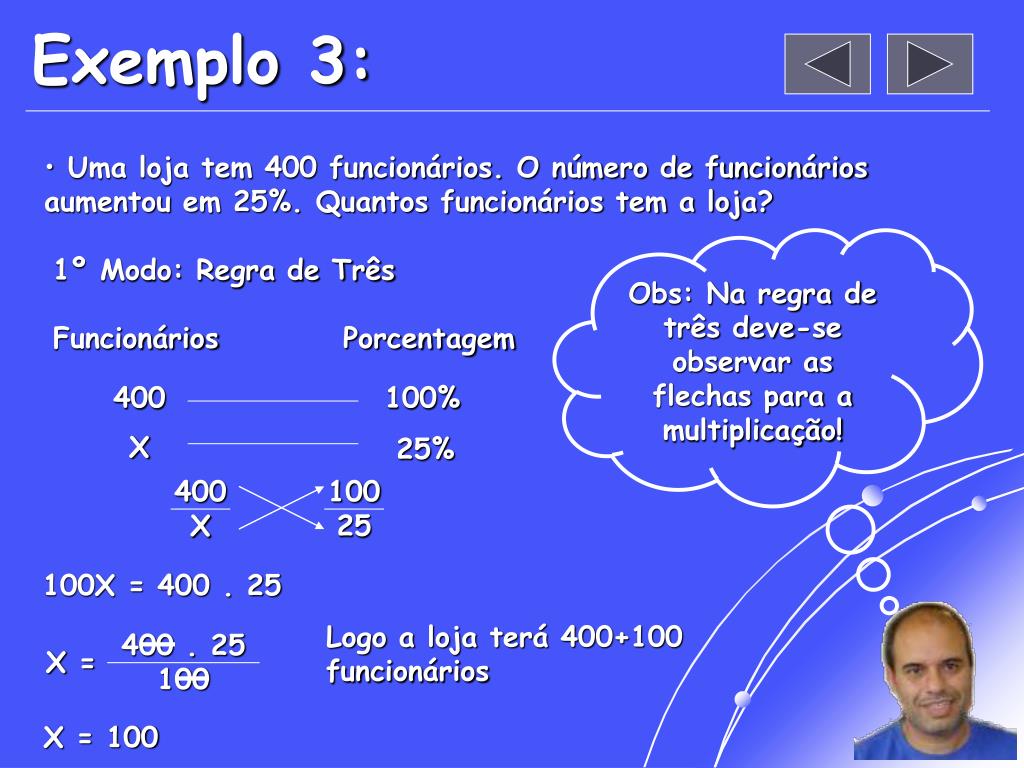 400 . 25 100 100 25 400 X Exemplo 3: • Uma loja tem 400 funcionários. O número de funcionários aumentou em 25%. Quantos funcionários tem a loja? Obs: Na regra de três deve-se observar as flechas para a multiplicação! 1º Modo: Regra de Três Funcionários Porcentagem 400 100% X 25% 100X = 400 . 25 Logo a loja terá 400+100 funcionários X = X = 100