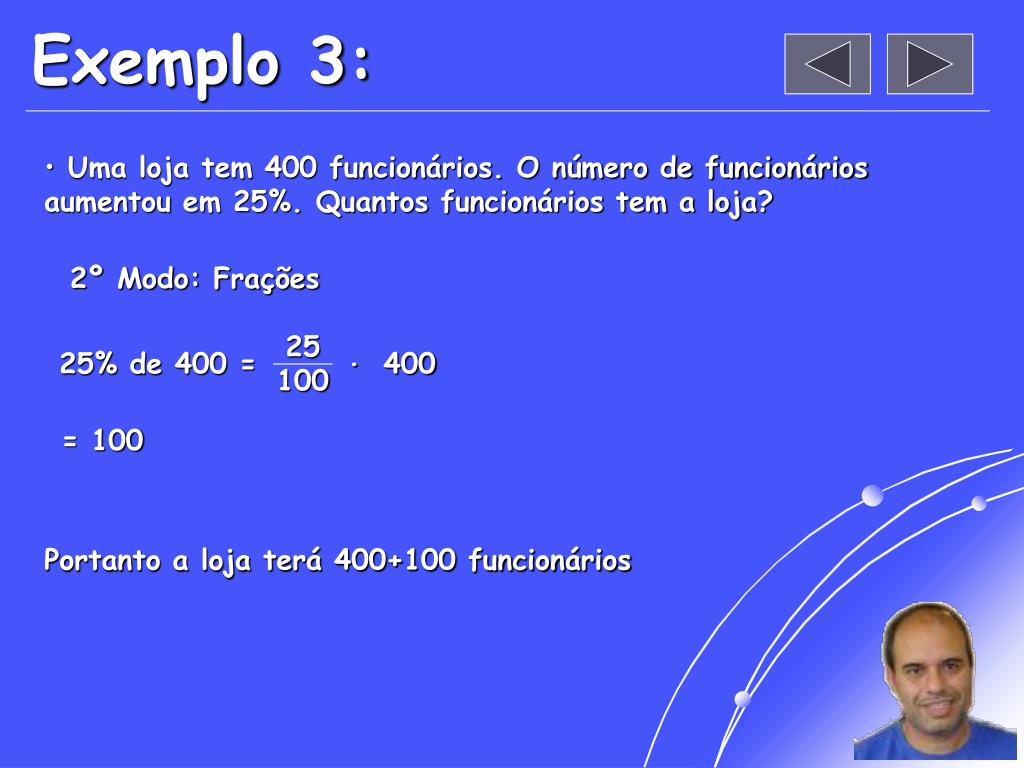 25 100 Exemplo 3: • Uma loja tem 400 funcionários. O número de funcionários aumentou em 25%. Quantos funcionários tem a loja? 2º Modo: Frações . 25% de 400 = 400 = 100 Portanto a loja terá 400+100 funcionários