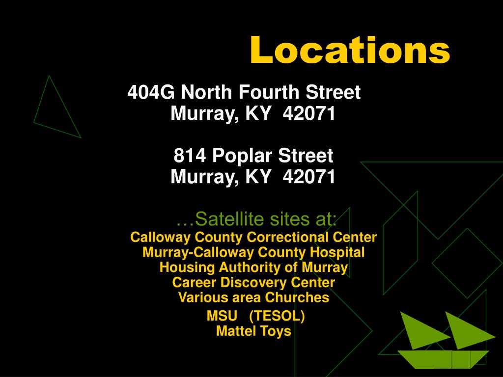 Locations 404G North Fourth StreetMurray, KY 42071814 Poplar StreetMurray, KY 42071…Satellite sites at:Calloway County Correctional Center Murray-Calloway County Hospital Housing Authority of Murray Career Discovery CenterVarious area Churches MSU (TESOL) Mattel Toys