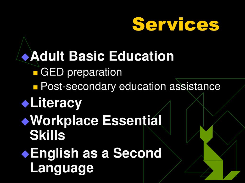 Services • Adult Basic Education • GED preparation • Post-secondary education assistance • Literacy • Workplace Essential Skills • English as a Second Language