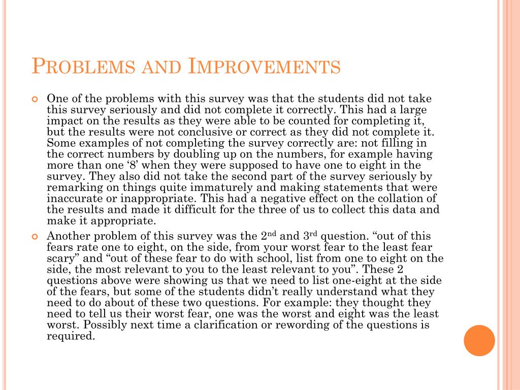 Problems and Improvements • One of the problems with this survey was that the students did not take this survey seriously and did not complete it correctly. This had a large impact on the results as they were able to be counted for completing it, but the results were not conclusive or correct as they did not complete it. Some examples of not completing the survey correctly are: not filling in the correct numbers by doubling up on the numbers, for example having more than one ‘8’ when they were supposed to have one to eight in the survey. They also did not take the second part of the survey seriously by remarking on things quite immaturely and making statements that were inaccurate or inappropriate. This had a negative effect on the collation of the results and made it difficult for the three of us to collect this data and make it appropriate. • Another problem of this survey was the 2nd and 3rd question. “out of this fears rate one to eight, on the side, from your worst fear to the least fear scary” and “out of these fear to do with school, list from one to eight on the side, the most relevant to you to the least relevant to you”. These 2 questions above were showing us that we need to list one-eight at the side of the fears, but some of the students didn’t really understand what they need to do about of these two questions. For example: they thought they need to tell us their worst fear, one was the worst and eight was the least worst. Possibly next time a clarification or rewording of the questions is required.