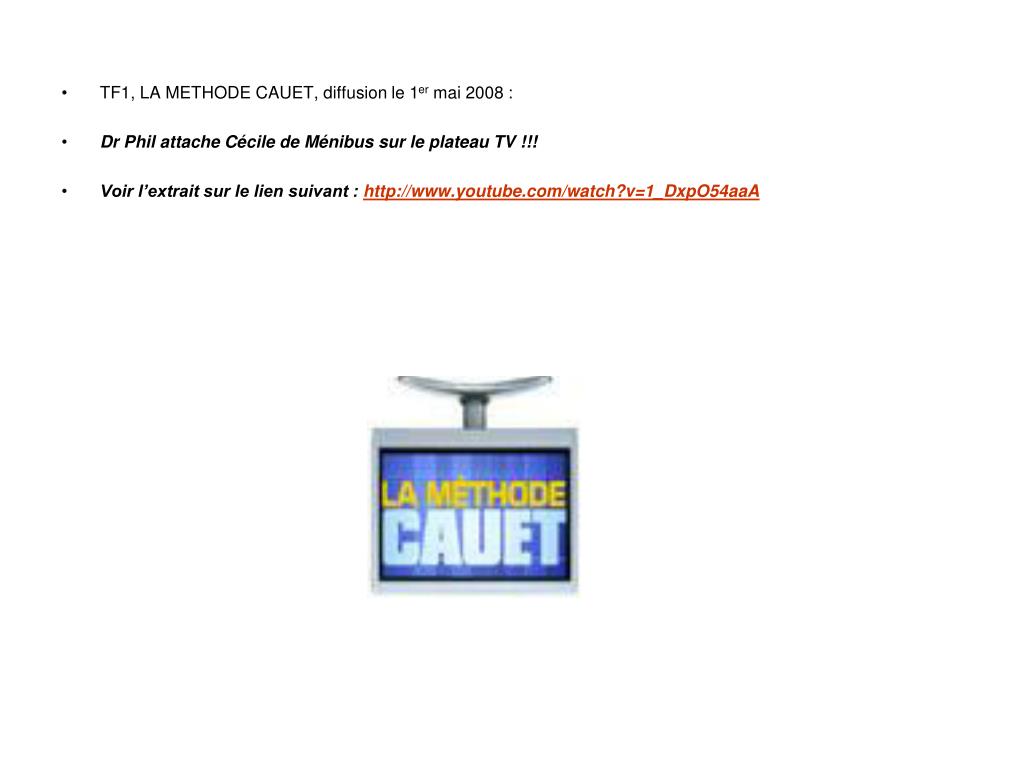 TF1, LA METHODE CAUET, diffusion le 1er mai 2008 : • Dr Phil attache Cécile de Ménibus sur le plateau TV !!! • Voir l’extrait sur le lien suivant : http://www.youtube.com/watch?v=1_DxpO54aaA