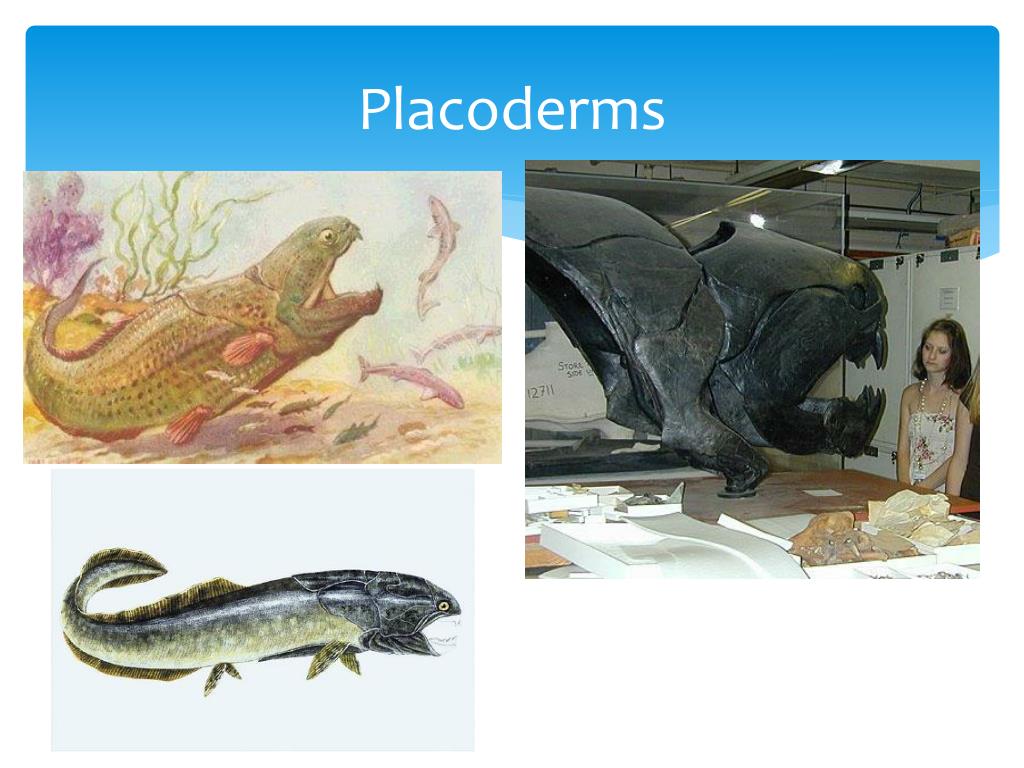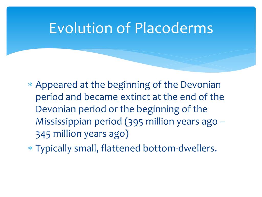 Evolution of Placoderms Appeared at the beginning of the Devonian period and became extinct at the end of the Devonian period or the beginning of the Mississippian period (395 million years ago – 345 million years ago) Typically small, flattened bottom-dwellers.