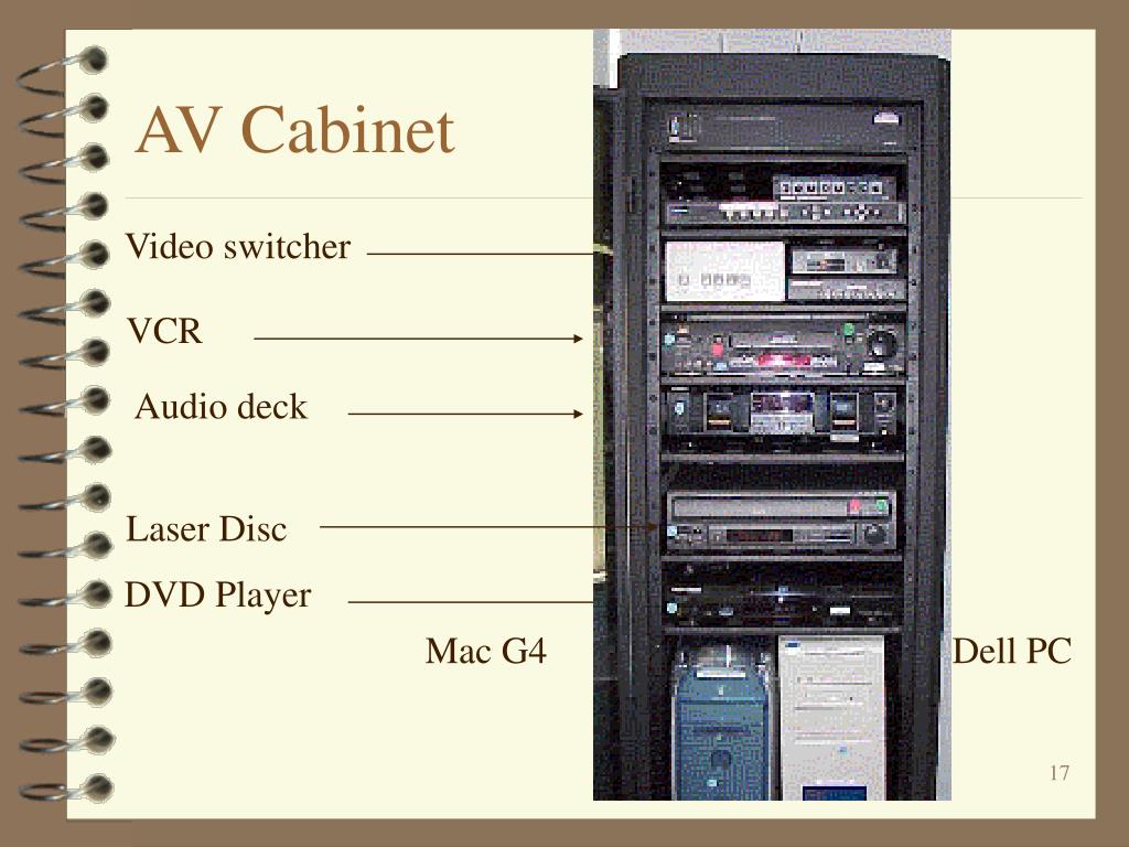 Audio/Visual Cabinet • Locked, (key issued to instructors) • Turn off power when not in use (computers stay on) • Equipment • VCR • Audio Tape recorder • DVD, CD-ROM player • Laser Disc (upon request) • Dell PC & Mac G4 CPUs • Video / Audio switch controller • Microphone mixer • Ethernet hub