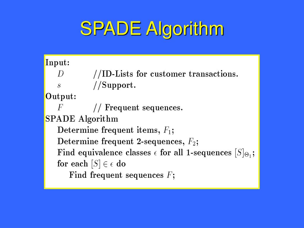 SPADE Example • ID-List for Sequences of length 1: • Count for <{A}> is 3 • Count for <{A},{D}> is 2