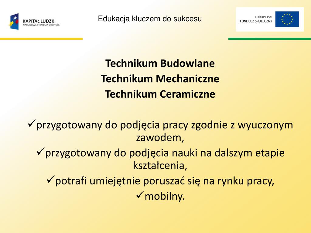 Edukacja kluczem do sukcesu Technikum Budowlane Technikum Mechaniczne Technikum Ceramiczne przygotowany do podjęcia pracy zgodnie z wyuczonym zawodem, przygotowany do podjęcia nauki na dalszym etapie kształcenia, potrafi umiejętnie poruszać się na rynku pracy, mobilny.