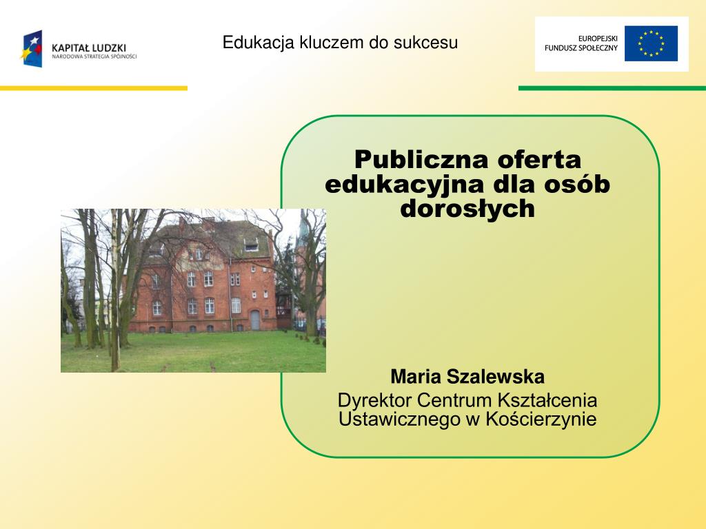 Edukacja kluczem do sukcesu Publiczna oferta edukacyjna dla osób dorosłych Maria Szalewska Dyrektor Centrum Kształcenia Ustawicznego w Kościerzynie