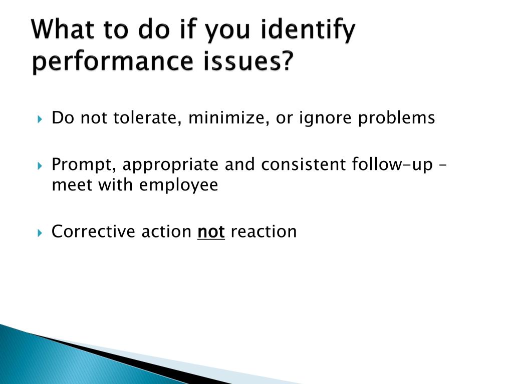 What to do if you identify performance issues? • Do not tolerate, minimize, or ignore problems • Prompt, appropriate and consistent follow-up – meet with employee • Corrective action not reaction
