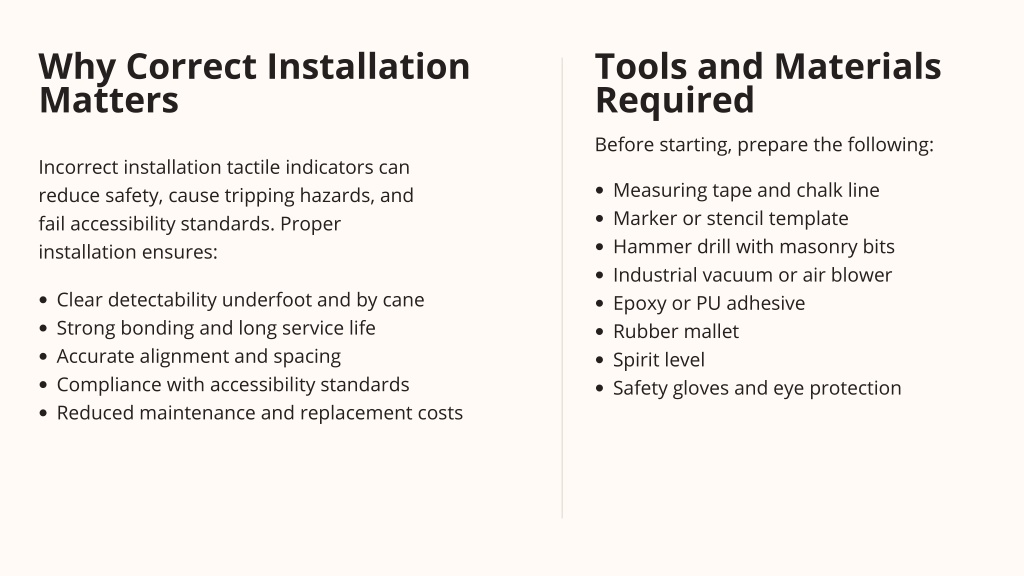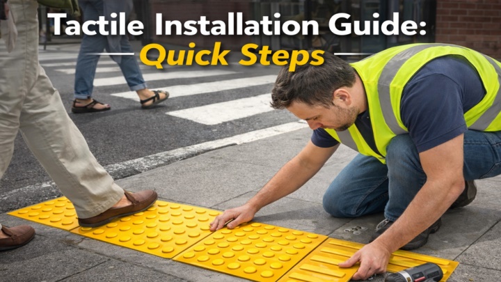 Why Correct Installation Matters Tools and Materials Required Before starting, prepare the following: Incorrect installation tactile indicators can reduce safety, cause tripping hazards, and fail accessibility standards. Proper installation ensures: Measuring tape and chalk line Marker or stencil template Hammer drill with masonry bits Industrial vacuum or air blower Epoxy or PU adhesive Rubber mallet Spirit level Safety gloves and eye protection Clear detectability underfoot and by cane Strong bonding and long service life Accurate alignment and spacing Compliance with accessibility standards Reduced maintenance and replacement costs