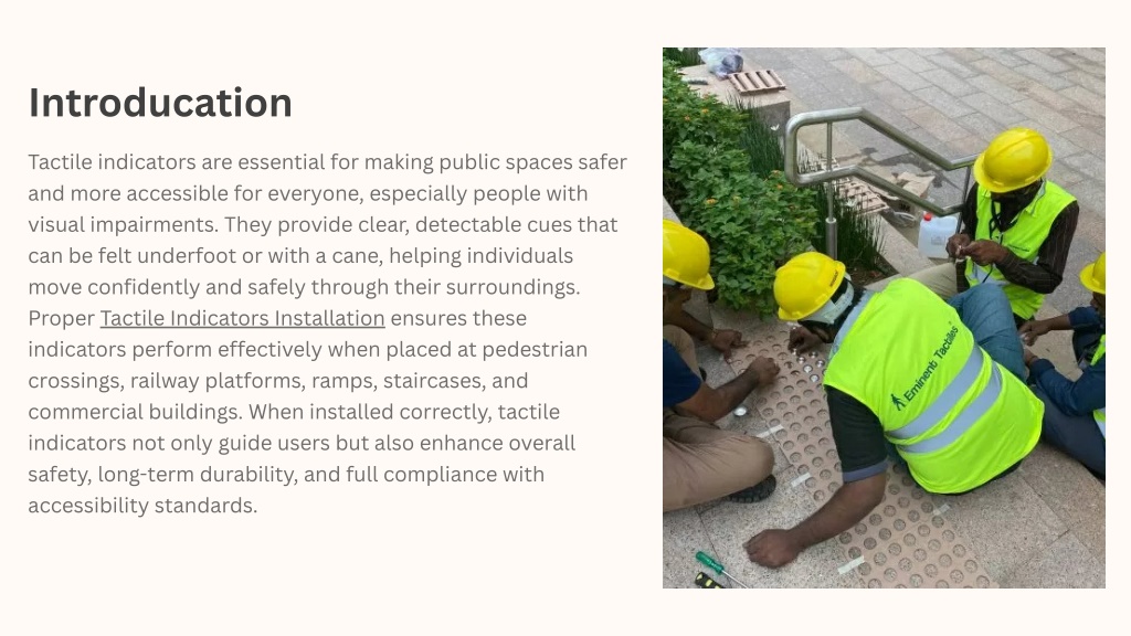 This explains how to install tactile indicators correctly in an easy and step-by-step way. It covers proper placement, spacing, surface preparation, and common mistakes to avoid. This guide is helpful for contractors, architects, builders, and anyone involved in accessible pathway design to ensure safety and compliance with accessibility standards.<br><br>Visit: https://tactileindicators.in/services/tactile-installation/