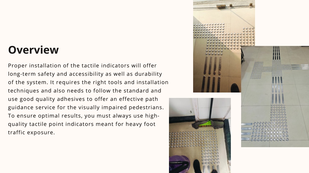 Overview Proper installation of the tactile indicators will offer long-term safety and accessibility as well as durability of the system. It requires the right tools and installation techniques and also needs to follow the standard and use good quality adhesives to offer an effective path guidance service for the visually impaired pedestrians. To ensure optimal results, you must always use high- quality tactile point indicators meant for heavy foot traffic exposure.