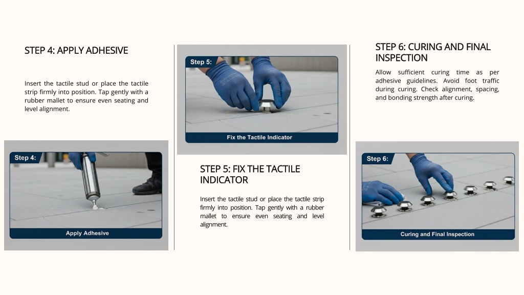 STEP 6: CURING AND FINAL STEP 6: CURING AND FINAL INSPECTION INSPECTION STEP 4: APPLY ADHESIVE STEP 4: APPLY ADHESIVE Allow sufficient curing time as per adhesive guidelines. Avoid foot traffic during curing. Check alignment, spacing, and bonding strength after curing. Insert the tactile stud or place the tactile strip firmly into position. Tap gently with a rubber mallet to ensure even seating and level alignment. STEP 5: FIX THE TACTILE STEP 5: FIX THE TACTILE INDICATOR INDICATOR Insert the tactile stud or place the tactile strip firmly into position. Tap gently with a rubber mallet to ensure even seating and level alignment.
