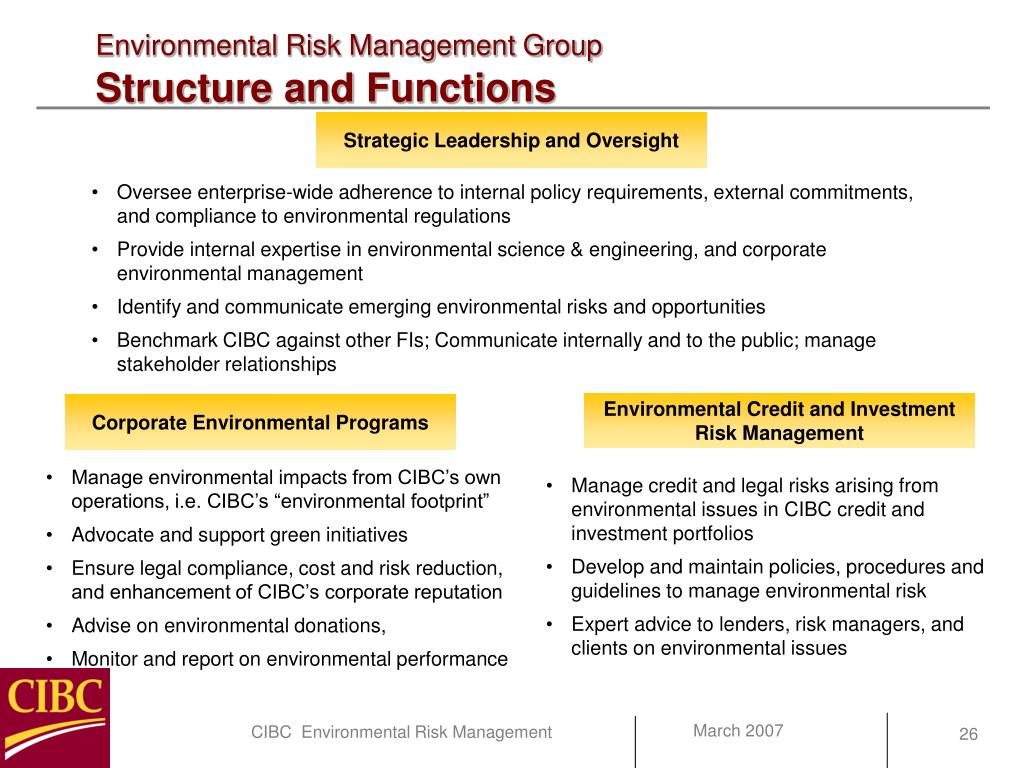 Environmental Risk Management Group • Oversight responsibility for Environmental Management at CIBC • Oversight of adherence to CIBC environmental policy and other environmental requirements and commitments • Corporate environmental footprint • Environmental credit risk management • Established in 1992 as part of TRM, Corporate Risk and Insurance Services • Originally driven by enactment of environmental legislation in Canada and the U.S. in the early 1990s that raised the possibility of significant credit and legal risk to banks associated with lending activities • Three full-time permanent staff: • Sandra Odendahl, Senior Director • Tony Basson, Senior Manager • Bill Christmas, Senior Manager CIBC Environmental Risk Management