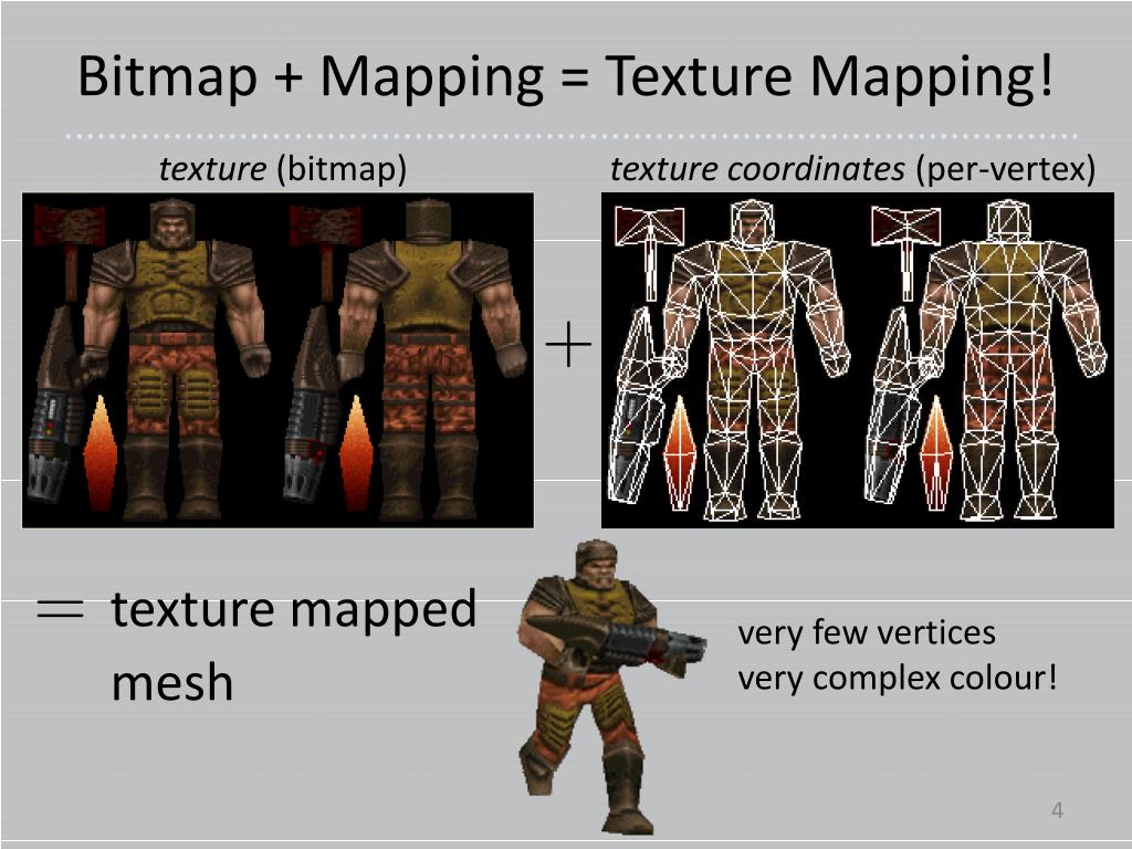 Bitmap + Mapping = Texture Mapping! texture (bitmap) texture coordinates (per-vertex) + = texture mapped mesh very few vertices very complex colour!