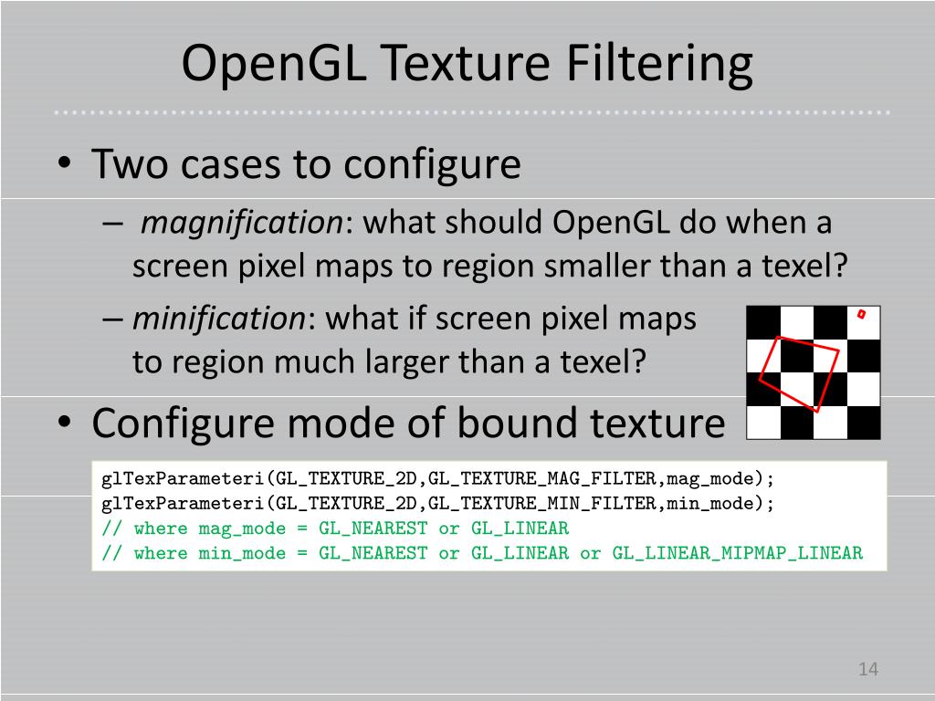 OpenGL Texture Filtering • Two cases to configure • magnification: what should OpenGL do when a screen pixel maps to region smaller than a texel? • minification: what if screen pixel maps to region much larger than a texel? • Configure mode of bound texture glTexParameteri(GL_TEXTURE_2D,GL_TEXTURE_MAG_FILTER,mag_mode); glTexParameteri(GL_TEXTURE_2D,GL_TEXTURE_MIN_FILTER,min_mode); // where mag_mode = GL_NEAREST or GL_LINEAR // where min_mode= GL_NEAREST or GL_LINEAR or GL_LINEAR_MIPMAP_LINEAR