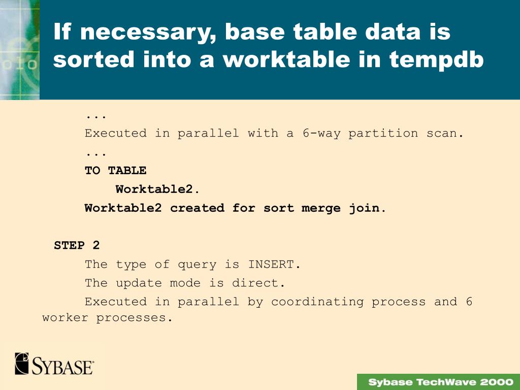 ... Executed in parallel with a 6-way partition scan. ... TO TABLE Worktable2. Worktable2 created for sort merge join. STEP 2 The type of query is INSERT. The update mode is direct. Executed in parallel by coordinating process and 6 worker processes. If necessary, base table data is sorted into a worktable in tempdb
