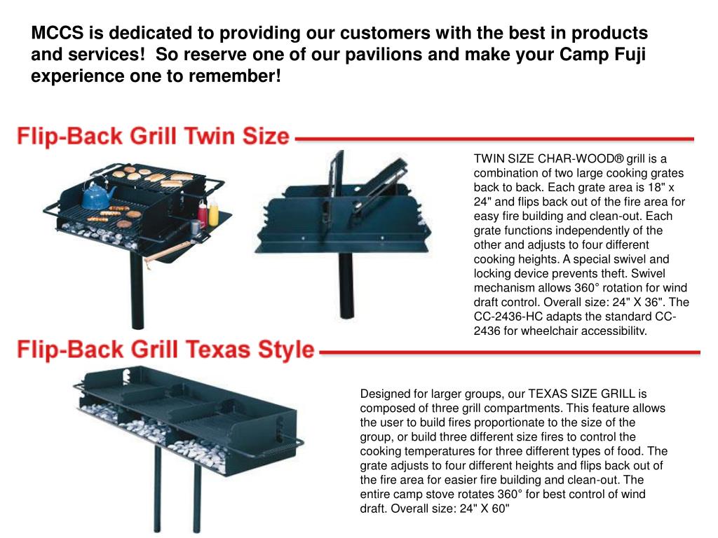 MCCS is dedicated to providing our customers with the best in products and services! So reserve one of our pavilions and make your Camp Fuji experience one to remember! Designed for larger groups, our TEXAS SIZE GRILL is composed of three grill compartments. This feature allows the user to build fires proportionate to the size of the group, or build three different size fires to control the cooking temperatures for three different types of food. The grate adjusts to four different heights and flips back out of the fire area for easier fire building and clean-out. The entire camp stove rotates 360° for best control of wind draft. Overall size: 24" X 60"