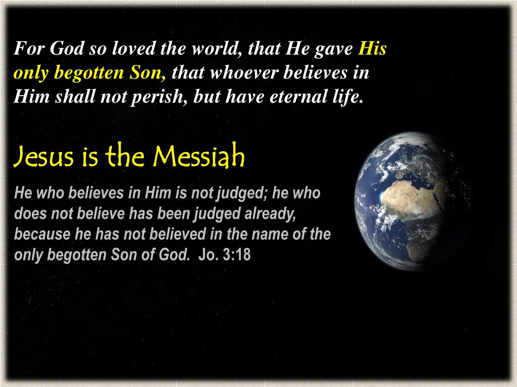 For God so loved the world, that He gave His only begotten Son, that whoever believes in Him shall not perish, but have eternal life. Jesus is the Messiah He who believes in Him is not judged; he who does not believe has been judged already, because he has not believed in the name of the only begotten Son of God. Jo. 3:18