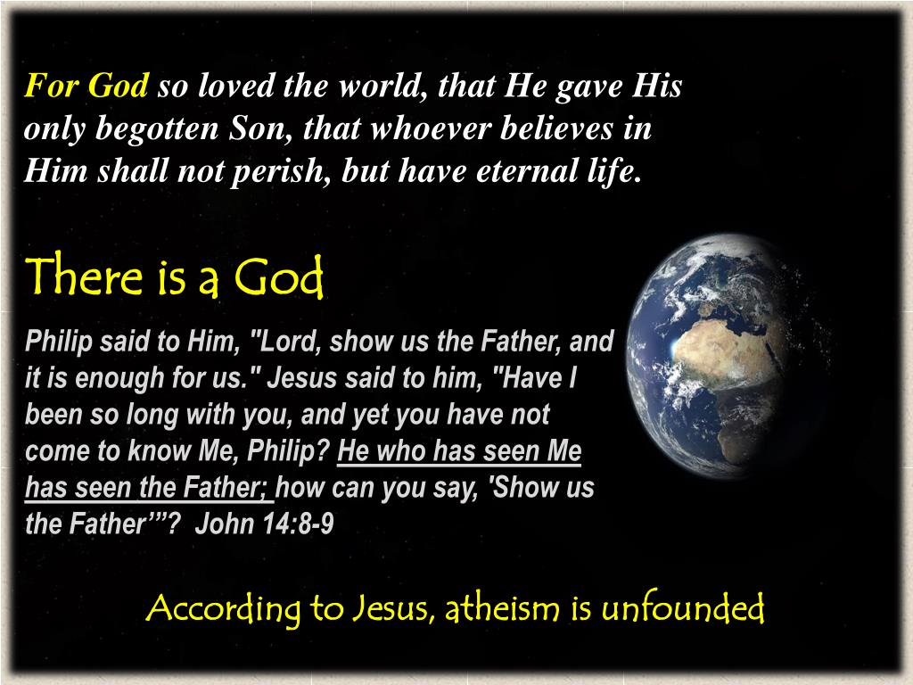 For God so loved the world, that He gave His only begotten Son, that whoever believes in Him shall not perish, but have eternal life. There is a God Philip said to Him, "Lord, show us the Father, and it is enough for us." Jesus said to him, "Have I been so long with you, and yet you have not come to know Me, Philip? He who has seen Me has seen the Father; how can you say, 'Show us the Father’”? John 14:8-9 According to Jesus, atheism is unfounded
