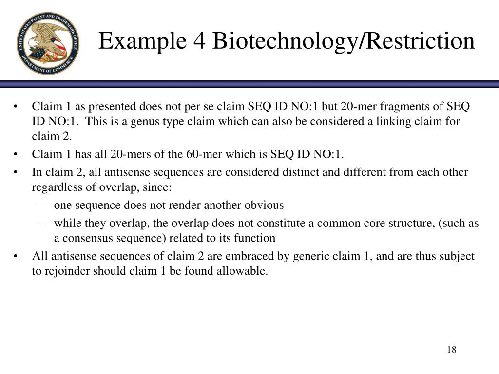 Example 4 Biotechnology/Restriction • Claim 1 as presented does not per se claim SEQ ID NO:1 but 20-mer fragments of SEQ ID NO:1. This is a genus type claim which can also be considered a linking claim for claim 2. • Claim 1 has all 20-mers of the 60-mer which is SEQ ID NO:1. • In claim 2, all antisense sequences are considered distinct and different from each other regardless of overlap, since: • one sequence does not render another obvious • while they overlap, the overlap does not constitute a common core structure, (such as a consensus sequence) related to its function • All antisense sequences of claim 2 are embraced by generic claim 1, and are thus subject to rejoinder should claim 1 be found allowable.