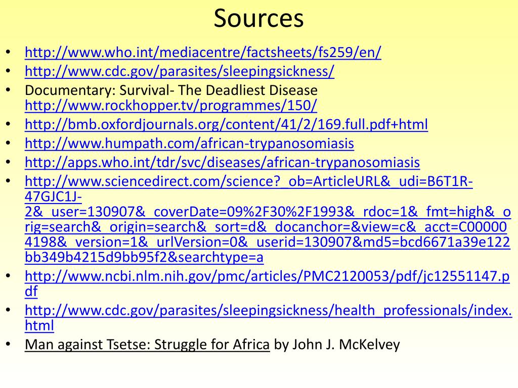 Sources • http://www.who.int/mediacentre/factsheets/fs259/en/ • http://www.cdc.gov/parasites/sleepingsickness/ • Documentary: Survival- The Deadliest Disease http://www.rockhopper.tv/programmes/150/ • http://bmb.oxfordjournals.org/content/41/2/169.full.pdf+html • http://www.humpath.com/african-trypanosomiasis • http://apps.who.int/tdr/svc/diseases/african-trypanosomiasis • http://www.sciencedirect.com/science?_ob=ArticleURL&_udi=B6T1R-47GJC1J-2&_user=130907&_coverDate=09%2F30%2F1993&_rdoc=1&_fmt=high&_orig=search&_origin=search&_sort=d&_docanchor=&view=c&_acct=C000004198&_version=1&_urlVersion=0&_userid=130907&md5=bcd6671a39e122bb349b4215d9bb95f2&searchtype=a • http://www.ncbi.nlm.nih.gov/pmc/articles/PMC2120053/pdf/jc12551147.pdf • http://www.cdc.gov/parasites/sleepingsickness/health_professionals/index.html • Man against Tsetse: Struggle for Africa by John J. McKelvey