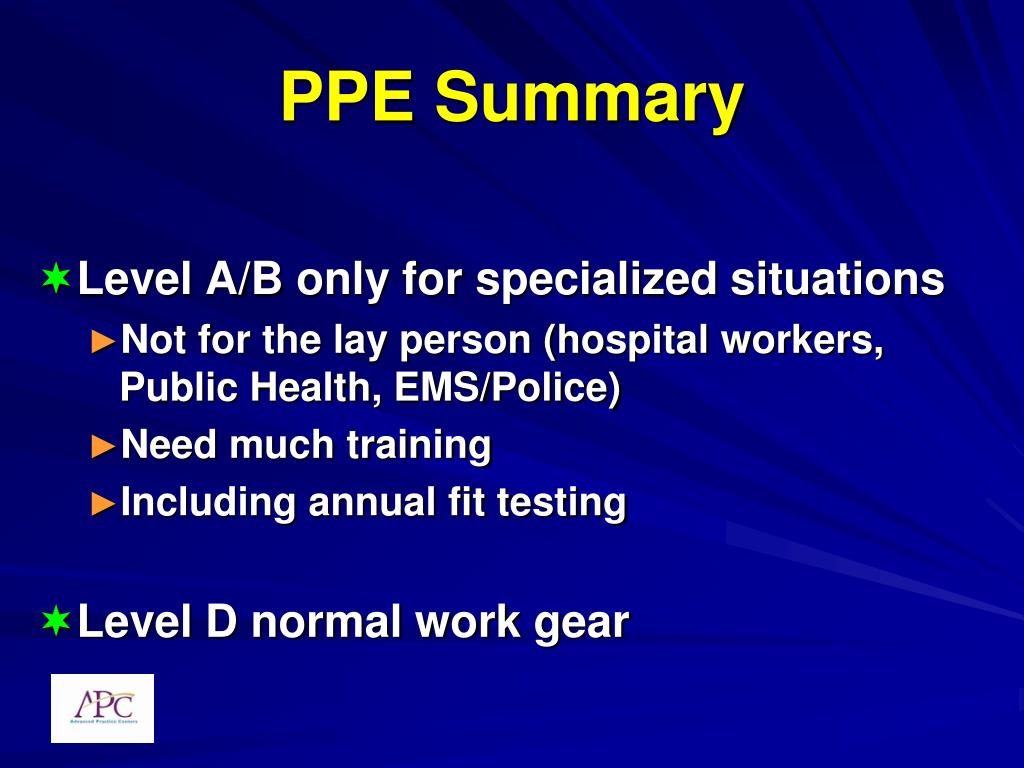 PPE Summary • Level A/B only for specialized situations • Not for the lay person (hospital workers, Public Health, EMS/Police) • Need much training • Including annual fit testing • Level D normal work gear