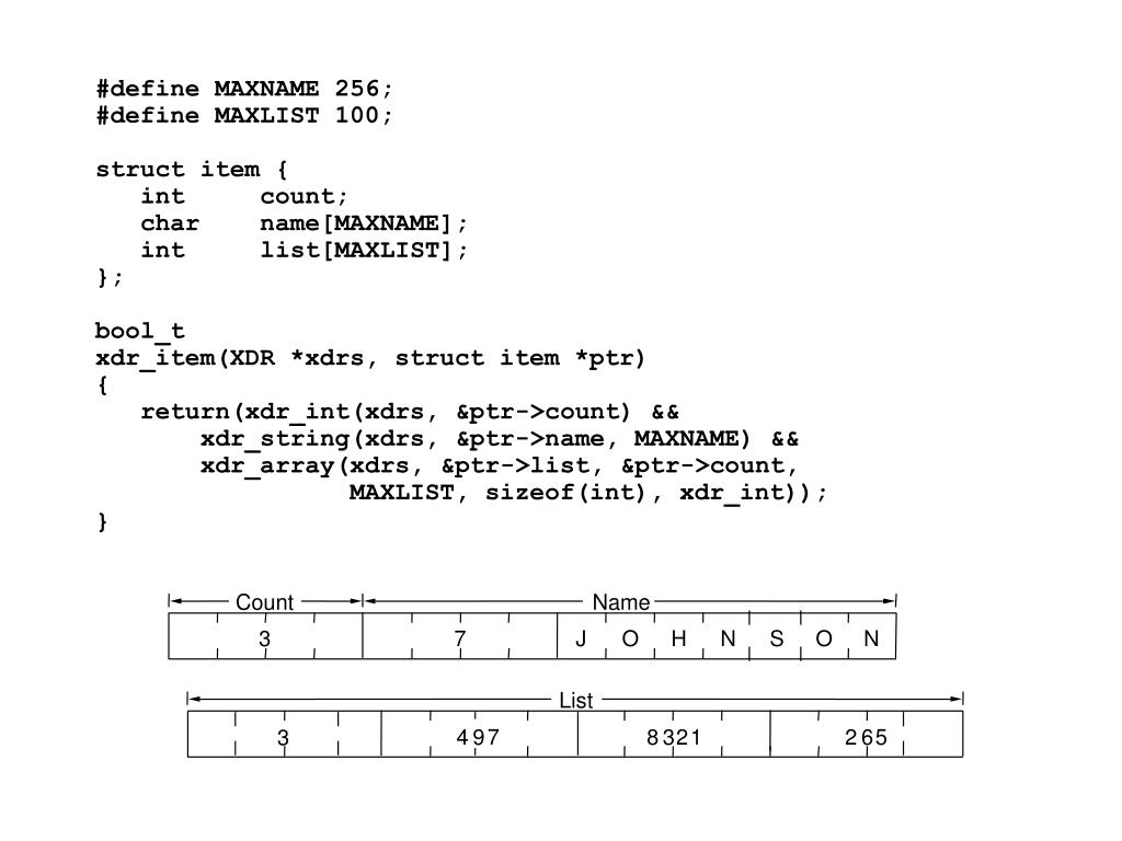 Count Name 3 7 J O H N S O N List 4 9 7 8 3 2 1 2 6 5 3 #define MAXNAME 256; #define MAXLIST 100; struct item { int count; char name[MAXNAME]; int list[MAXLIST]; }; bool_t xdr_item(XDR *xdrs, struct item *ptr) { return(xdr_int(xdrs, &ptr->count) && xdr_string(xdrs, &ptr->name, MAXNAME) && xdr_array(xdrs, &ptr->list, &ptr->count, MAXLIST, sizeof(int), xdr_int)); }
