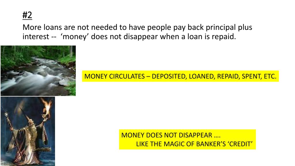 #2 More loans are not needed to have people pay back principal plus interest -- ‘money’ does not disappear when a loan is repaid. MONEY CIRCULATES – DEPOSITED, LOANED, REPAID, SPENT, ETC. MONEY DOES NOT DISAPPEAR …. LIKE THE MAGIC OF BANKER’S ‘CREDIT’