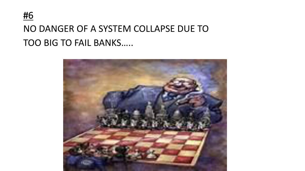 #6 NO DANGER OF A SYSTEM COLLAPSE DUE TO TOO BIG TO FAIL BANKS…..