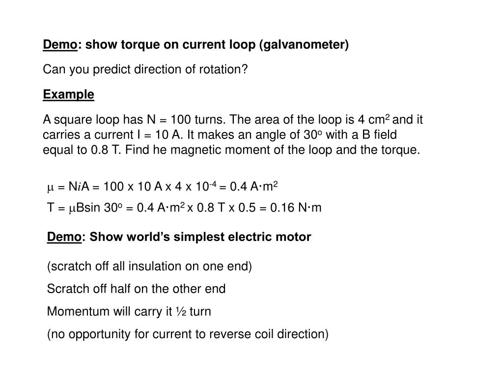 Demo: show torque on current loop (galvanometer) Example Can you predict direction of rotation? A square loop has N = 100 turns. The area of the loop is 4 cm2 and it carries a current I = 10 A. It makes an angle of 30o with a B field equal to 0.8 T. Find he magnetic moment of the loop and the torque. = NiA = 100 x 10 A x 4 x 10-4 = 0.4 A·m2 T = Bsin 30o = 0.4 A·m2 x 0.8 T x 0.5 = 0.16 N·m Demo: Show world’s simplest electric motor (scratch off all insulation on one end) Scratch off half on the other end Momentum will carry it ½ turn (no opportunity for current to reverse coil direction)