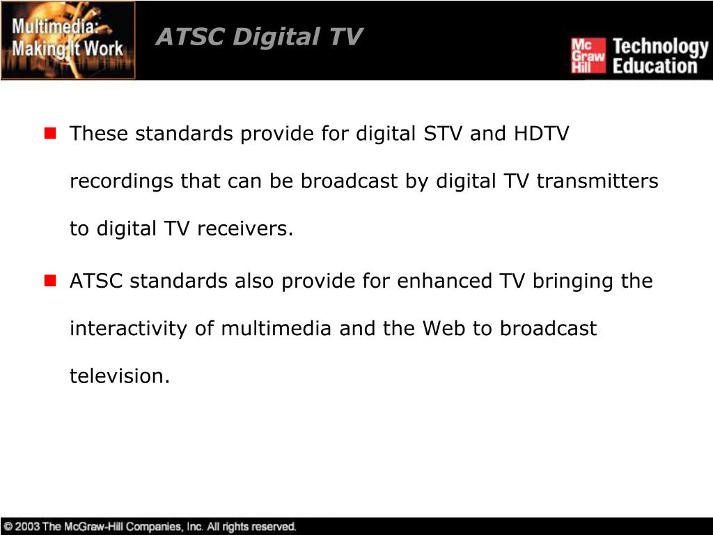 ATSC Digital TV • These standards provide for digital STV and HDTV recordings that can be broadcast by digital TV transmitters to digital TV receivers. • ATSC standards also provide for enhanced TV bringing the interactivity of multimedia and the Web to broadcast television.
