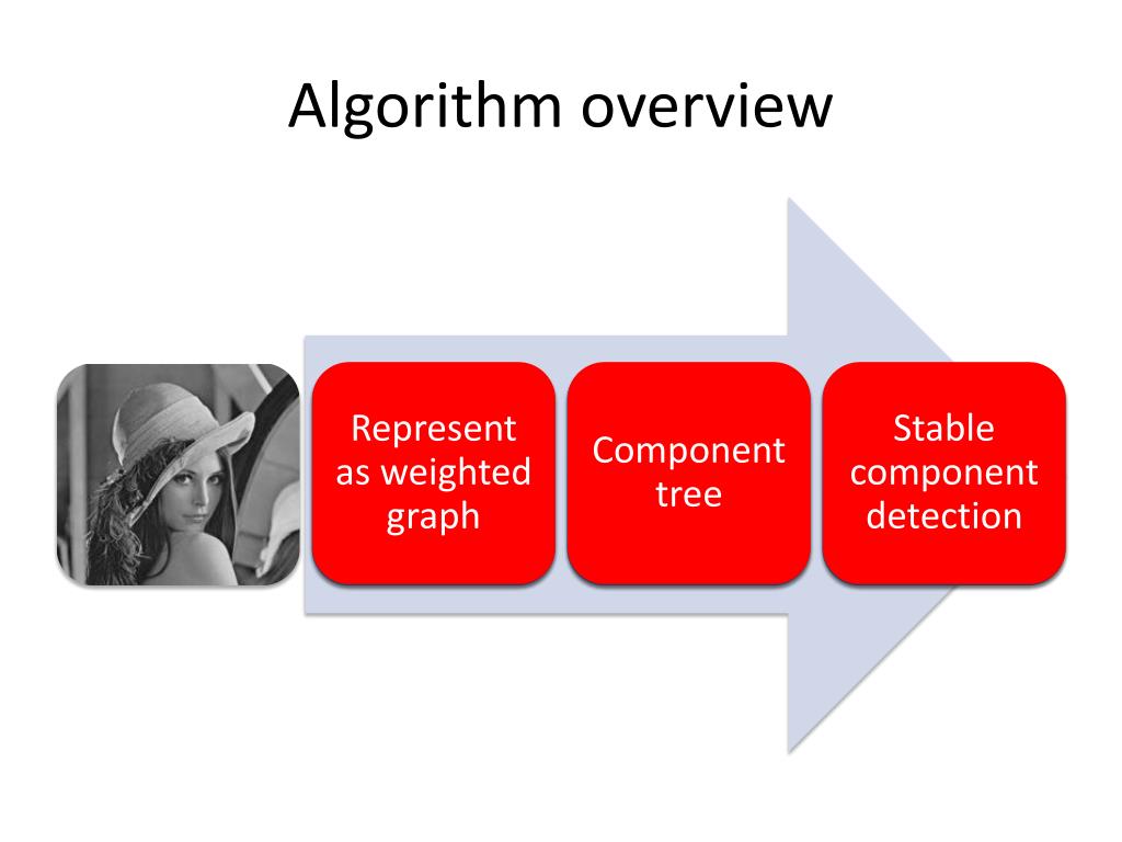 Algorithm overview • Represent as weighted graph • Component tree • Stable component detection