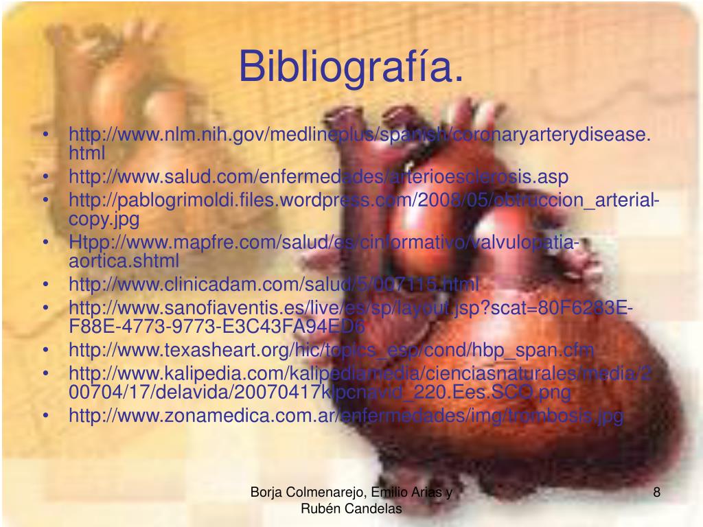 Bibliografía. • http://www.nlm.nih.gov/medlineplus/spanish/coronaryarterydisease.html • http://www.salud.com/enfermedades/arterioesclerosis.asp • http://pablogrimoldi.files.wordpress.com/2008/05/obtruccion_arterial-copy.jpg • Htpp://www.mapfre.com/salud/es/cinformativo/valvulopatia-aortica.shtml • http://www.clinicadam.com/salud/5/007115.html • http://www.sanofiaventis.es/live/es/sp/layout.jsp?scat=80F6283E-F88E-4773-9773-E3C43FA94ED6 • http://www.texasheart.org/hic/topics_esp/cond/hbp_span.cfm • http://www.kalipedia.com/kalipediamedia/cienciasnaturales/media/200704/17/delavida/20070417klpcnavid_220.Ees.SCO.png • http://www.zonamedica.com.ar/enfermedades/img/trombosis.jpg Borja Colmenarejo, Emilio Arias y Rubén Candelas