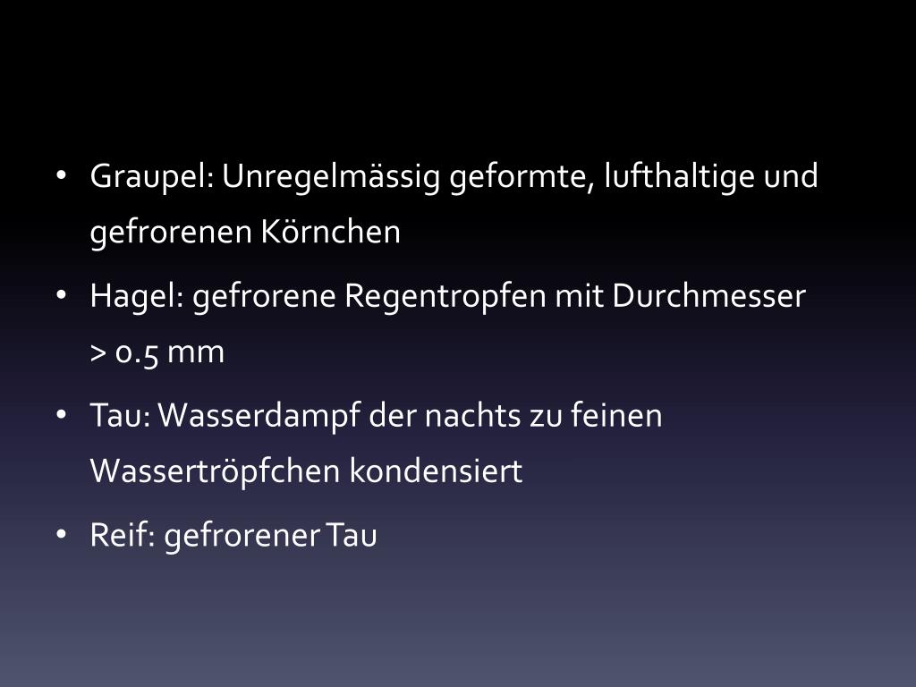 Graupel: Unregelmässiggeformte, lufthaltige und gefrorenen Körnchen • Hagel: gefrorene Regentropfen mit Durchmesser > 0.5 mm • Tau: Wasserdampf der nachts zu feinen Wassertröpfchen kondensiert • Reif: gefrorener Tau