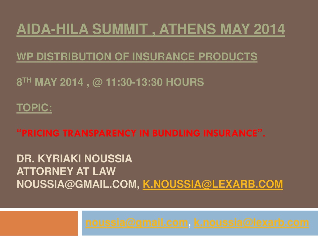 AIDA-HILA SUMMIT , ATHENS MAY 2014WP DISTRIBUTION OF INSURANCE PRODUCTS8th May 2014 , @ 11:00-13:00 hoursTopic:“PRICING TRANSPARENCY IN BUNDLING INSURANCE”.THANK YOU FOR YOUR ATTENTION ! Dr. KyriakiNoussiaAttorney at Lawnoussia@gmail.com, k.noussia@lexarb.com noussia@gmail.com, k.noussia@lexarb.com